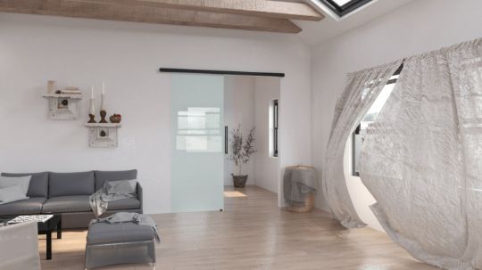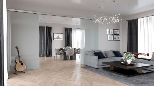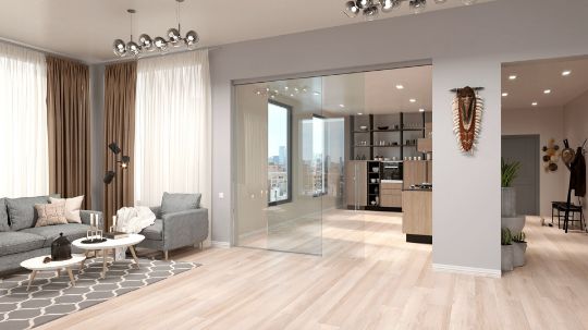 Это бескаркасная раздвижная стеклянная дверь с полированными краями по периметру. Ее главное преимущество - минималистичный дизайн: четкость, простота и легковесность конструкции.